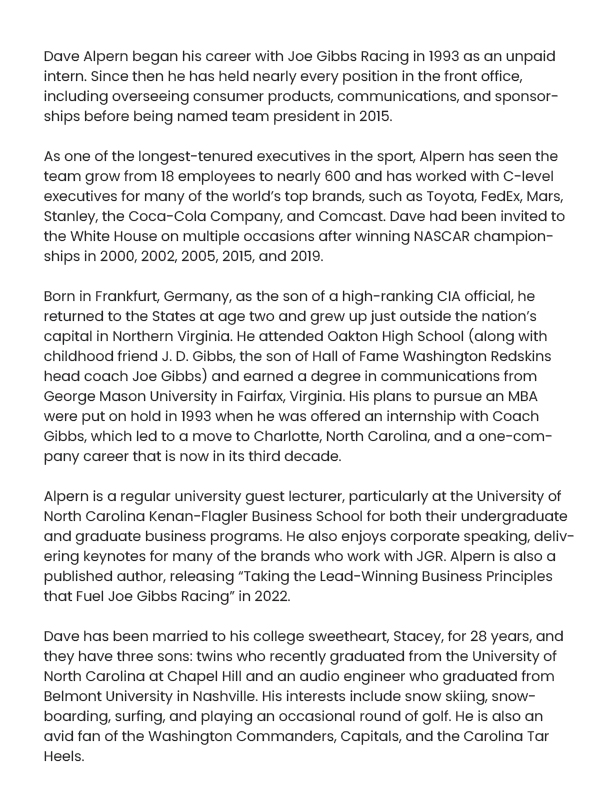 Dave Alpern President at Joe Gibbs Racing Read Dave's Bio