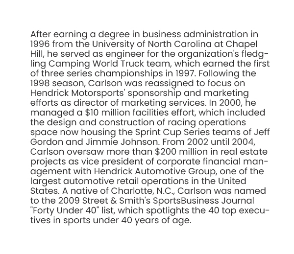 Marshall Carlson President of Hendrick Motorsports Read Marshall's Bio